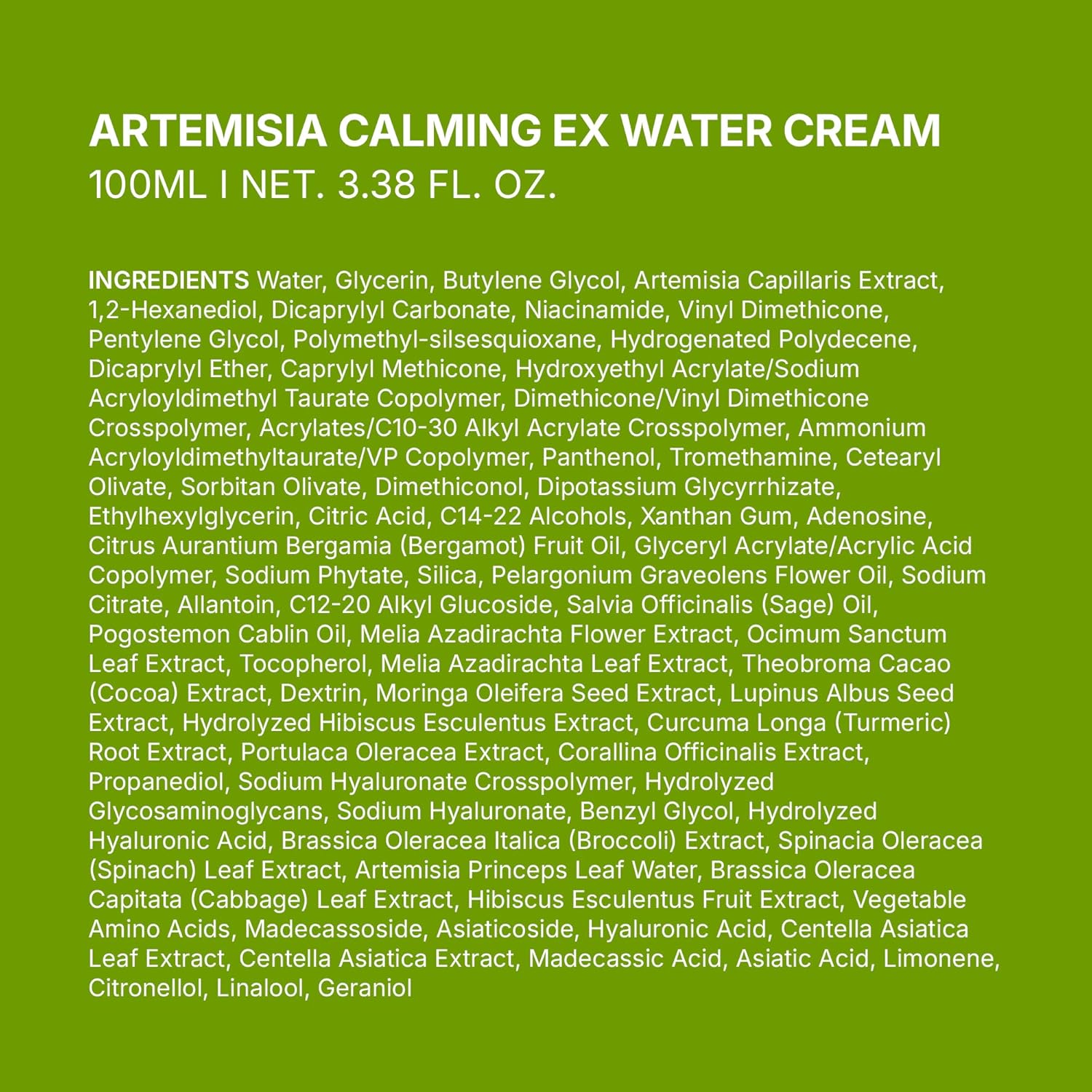 Purified Water, Glycerin, Butylene Glycol, Artemisia Capillaris Extract, 1,2-Hexanediol, Dicaprylyl Carbonate, Niacinamide, Vinyl Dimethicone, Pentylene Glycol, Polymethylsilsesquioxane, Hydrogenated Polydecene, Dicaprylyl Ether, Caprylyl Methicone, Hydroxyethyl Acrylate/Sodium Acryloyldimethyl Taurate Copolymer, Dimethicone/Vinyl Dimethicone Crosspolymer, Acrylates/C10-30 Alkyl Acrylate Crosspolymer, Ammonium Acryloyldimethyl Taurate/VP Copolymer, Panthenol, Tromethamine, Cetearyl Olivate, Sorbitan Olivate, Dimethiconol, Dipotassium Glycyrrhizate, Ethylhexylglycerin, Citric Acid, C14-22 Alcohols, Xanthan Gum, Adenosine, Bergamot Fruit Oil, Glyceryl Acrylate/Acrylic Acid Copolymer, Sodium Phytate, Silica, Scented Geranium Flower Oil, Sodium Citrate, Allantoin, C12-20 Alkyl Glucoside, Salvia Oil, Citrus Aurantium Dulcis Oil, Indian Mulberry Flower Extract, Holy Basil Leaf Extract, Tocopherol, Indian Mulberry Leaf Extract, Cacao Extract, Dextrin, Drumstick Seed Extract, White Lupine Seed Extract, Hydrolyzed Okra Extract, Curcuma Longa Root Extract, Purslane Extract, Coral, Algae Extract, Propanediol, Sodium Hyaluronate Crosspolymer, Hydrolyzed Glycosaminoglycans, Sodium Hyaluronate, Benzyl Glycol, Hydrolyzed Hyaluronic Acid, Broccoli Extract, Spinach Extract, Mugwort, Leaf Water, Cabbage Extract, Okra Fruit Extract, Vegetable Amino Acids, Madecassoside, Asiaticoside, Hyaluronic Acid, Centella Asiatica Leaf Extract, Centella Asiatica Extract, Madecassic Acid, Asiatic Acid, Limonene, Citronellol, Linalool, Geraniol