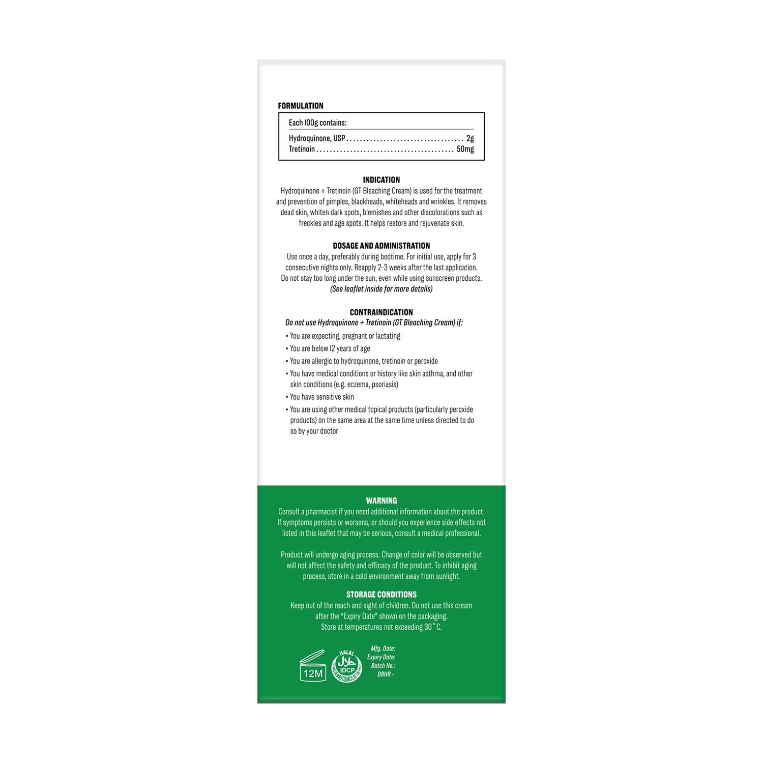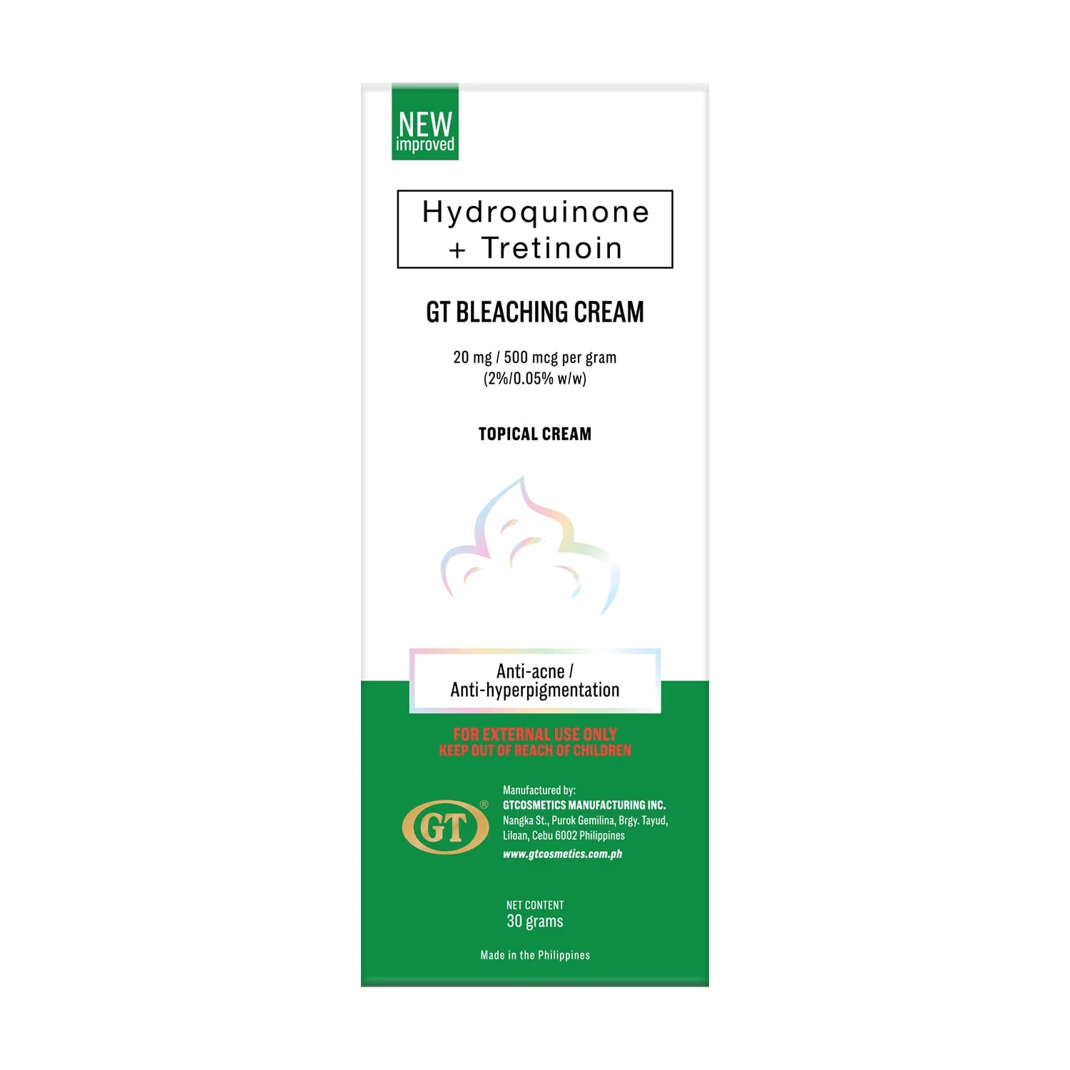 La crème éclaircissante GT à base d'hydroquinone et de trétinoïne est utilisée pour le traitement et la prévention des boutons, points noirs, points blancs et rides. Elle élimine les cellules mortes, atténue les taches brunes, les imperfections et autres décolorations cutanées telles que les taches de rousseur et les taches de vieillesse. Elle contribue également à régénérer et à rajeunir la peau.