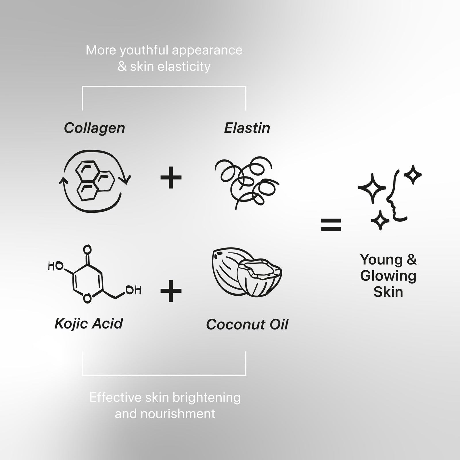 Huile de Cocos Nucifera, eau, hydroxyde de sodium, acide kojique, glycérine, extrait de miel, collagène soluble, élastine hydrolysée, PCA de sodium, sérine, glycogène, parfum, gomme xanthane, caprylyl glycol, glucose, Chondrus Crispus, phénoxyéthanol, éthylhexylglycérine, cocamide DEA, huile de Melaleuca Alternifolia, dioxyde de titane, huile minérale, BHT