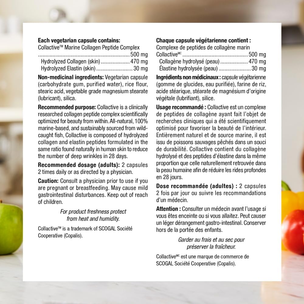 Marine Collagen30 contient du CollactiveMC cliniquement étudié, un ingrédient composé de peptides de collagène et d’élastine formulé dans le même rapport que celui que l’on trouve naturellement dans la peau humaine. La clé réside dans les peptides, qui sont de minuscules morceaux de collagène facilement digérés et utilisés par l’organisme, contrairement aux autres formes de collagène.